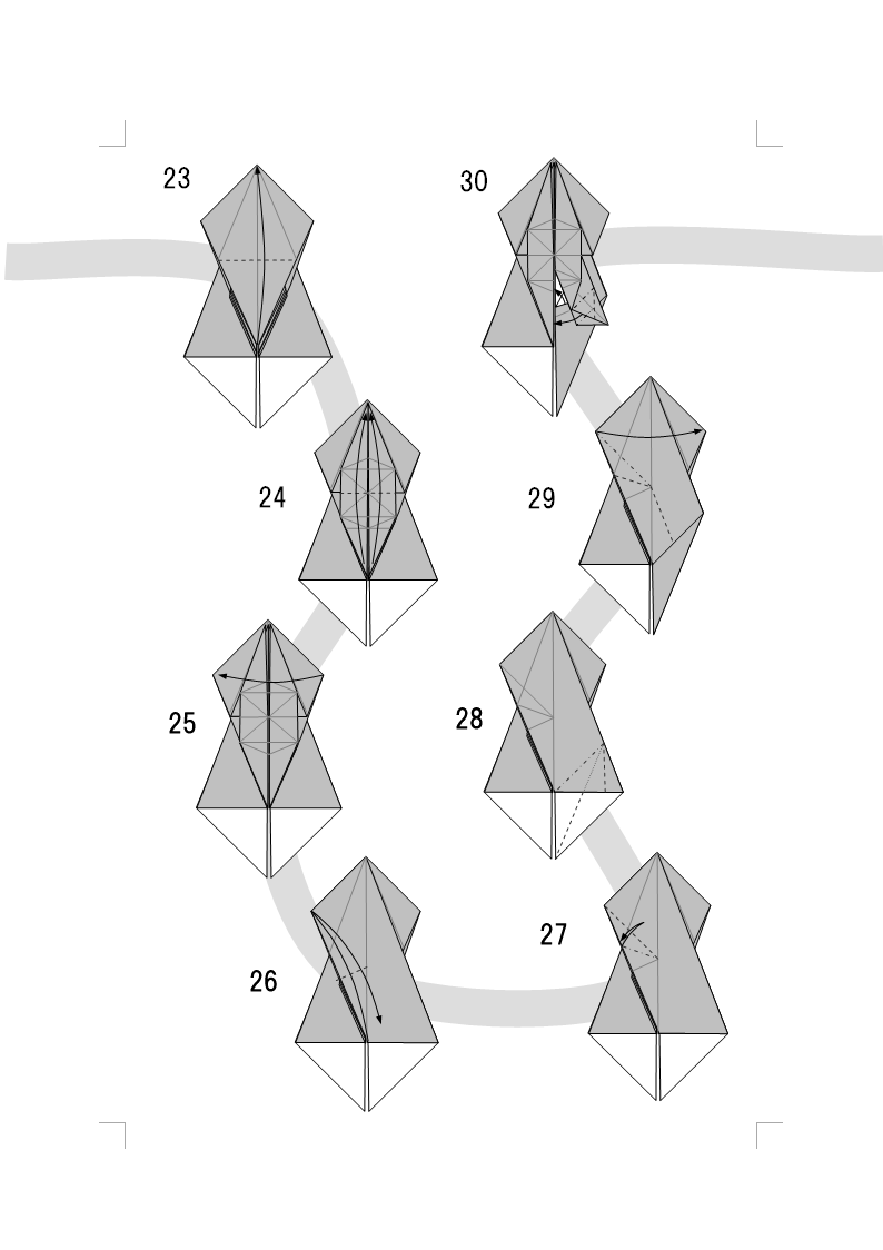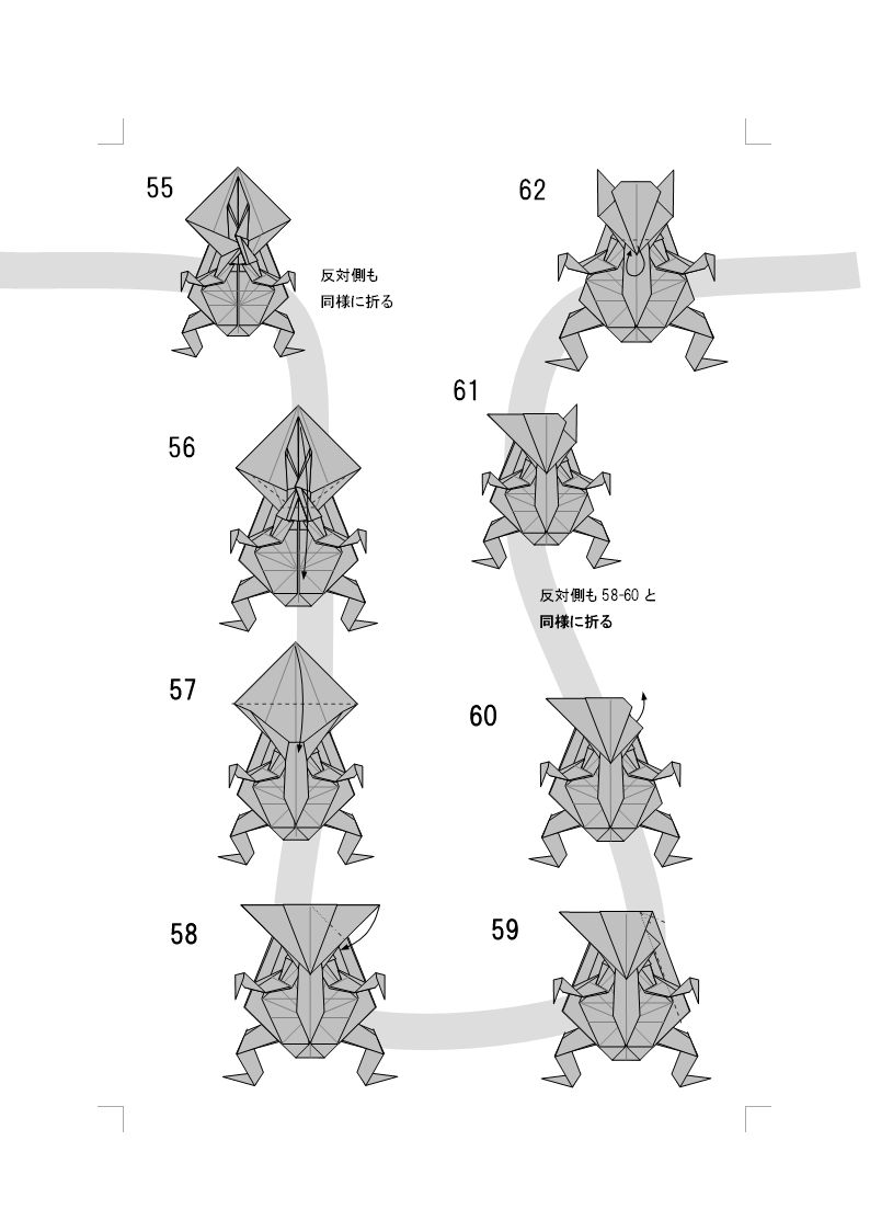 創作 2003年2月 創作期間 3週間(実際に折っていたのは10日ほど) 舌から作り始めて顔、体と広げていきました(おおめだま、あばれうしどりも同じような感じです)。 指の折り出しにはこだわっていません。とりあえず1週間で大体の形が出来上がるも、 顔が今一つだったのでしばらく放っておきました。創作に行き詰まった時は、 しばらく間をおくと大抵良い折り方が見つかります。この作品も10日ほど間をおいて 再び取り掛かるとサクサク進み、ほどなく完成。ドラクエ作品の中では創作時間はかなり短い方です。